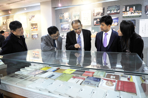 在吕明董事长等陪同下,蔻斯(Kose John)教授等参观了季羡林国学院和学校科研信息科技大楼。
