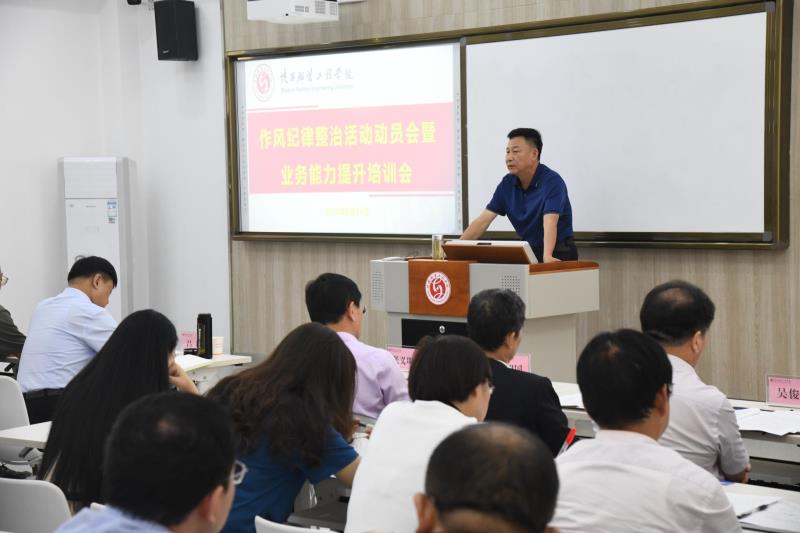 常务副校长李望国教授对开展作风纪律专项整治暨业务能力提升培训活动进行了安排部署。他指出了开展这次活动的指导思想、目标任务、整顿重点、活动安排和工作要求。他要求各部门要提前规划提早部署,布好局、开好头、落实好责任;服好务,要体现出服务意识、服务态度、服务质量;要做好安全稳定的大排查,消除隐患;各单位各部门每个人都要将评估的“二十字”方针贯穿于工作的方方面面。新学期要有新面貌新风尚新作为。