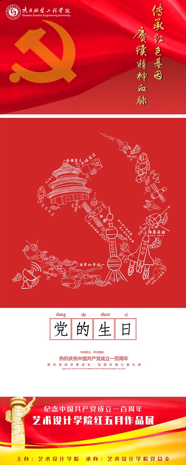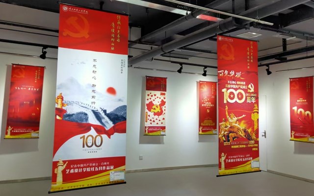 近100幅参展作品主要以师生联展为主,集合招贴设计、摄影、剪纸等多种艺术形式与党史元素进行完美融合,内容以庆祝中国共产党成立100周年为核心,以美为媒,充分展示师生的聪明才智、艺术设计天赋,用现代美术艺术表达感恩祖国、感恩党的主题,凸显思政课程、课程思政的实施效果及党史学习教育成果,用自己的方式向党的生日献礼。