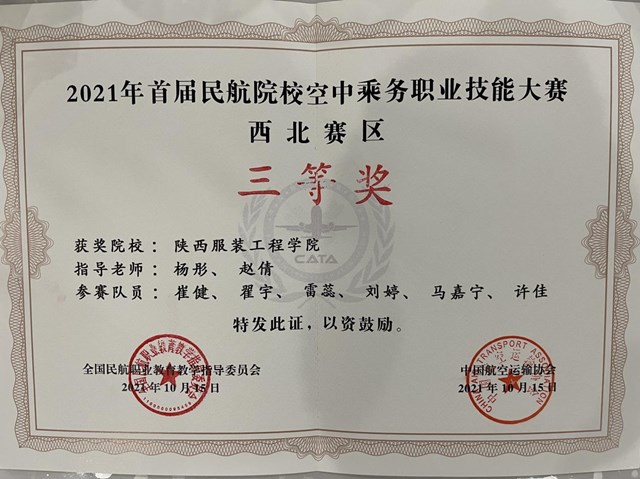 陕服新闻网讯(左菊香)2021年10月15日,我校服装学院空中乘务专业在2021年首届民航院校空中乘务职业技能大赛中荣获团体三等奖。本次大赛为全面贯彻习近平总书记在全国职业教育大会上对职业教育工作的重要指示精神,落实民航局党组对专业人才培养的要求,进一步推进院校民航空中乘务专业建设,以赛促教、以赛提质、以赛培优。协会拟在全国民航职业教育教学指导委员会的指导下,举办2021年首届民航院校空中乘务职业技能大赛。