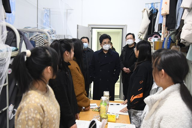 在学生公寓楼,董事长慰问了辅导员和学生,关心学生的学习生活情况,要求有关部门进一步做好关爱学生工作,鼓励学生战胜疫情,实现人生理想。
