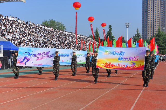 8:10运动会开幕式开始。踏着运动员进行曲的节拍,校国旗护卫队掌着国旗、奥运五环旗、校旗引领仪仗队、裁判员、运动员依次入场经过主席台并绕场一周后在操场列队。全体人员起立奏唱中华人民共和国国歌。