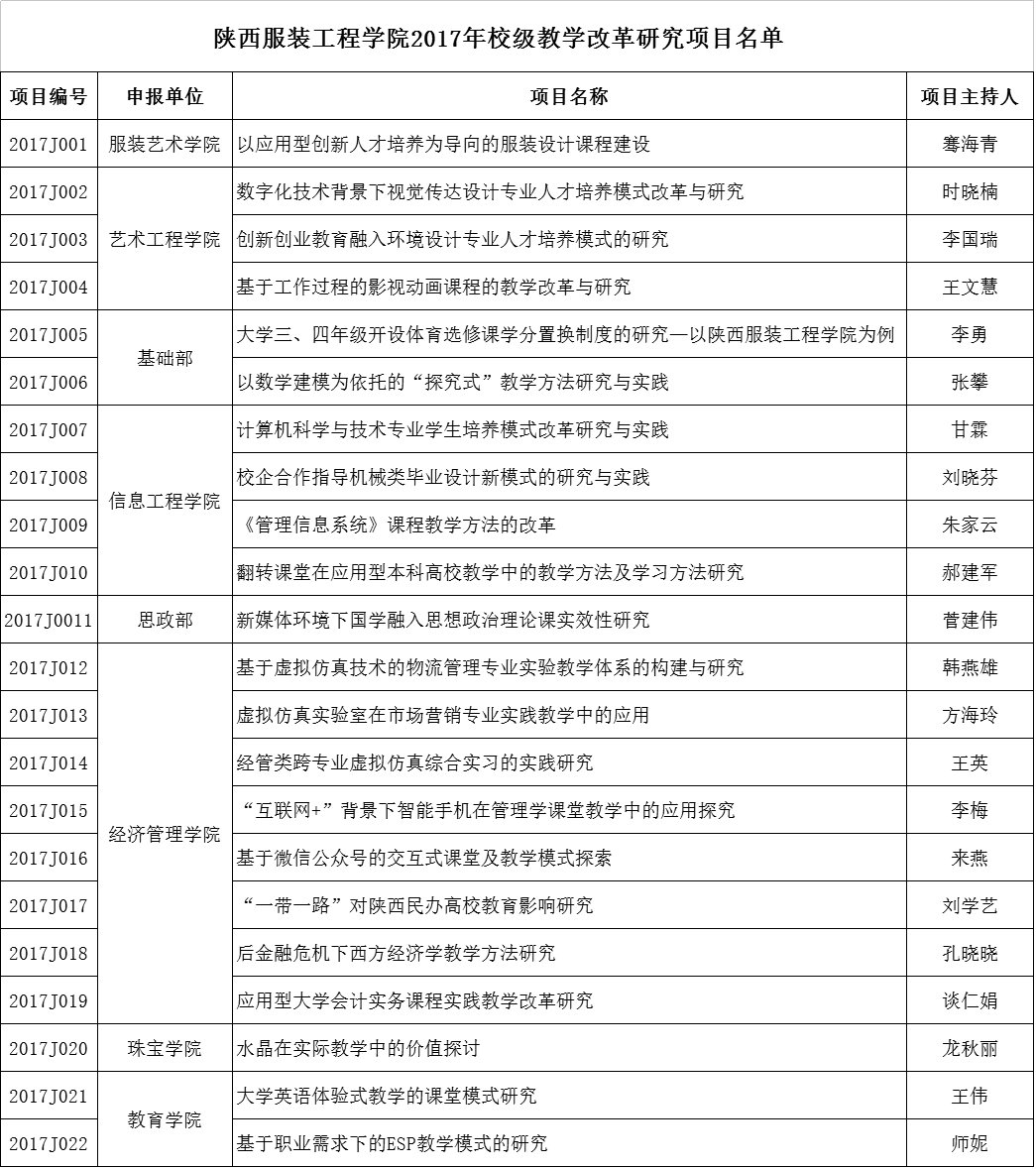 根据“关于开展2017年校级教学改革研究项目申报工作的通知”精神,经个人申报、学院推荐、学校组织相关专家评审,确定“以应用型创新人才培养为导向的服装设计课程建设”等22个项目为2017年校级教学改革研究项目。