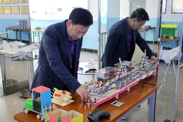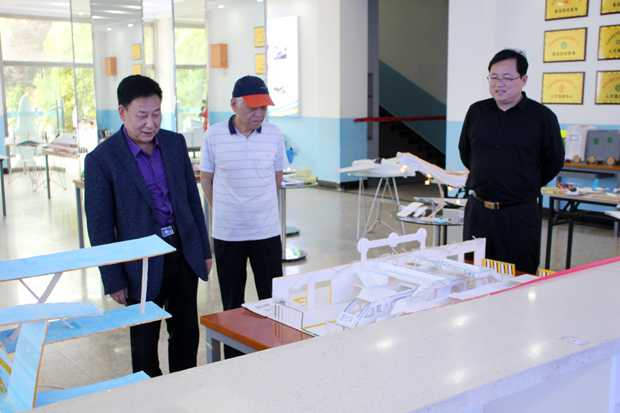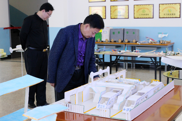 校长张义明、学生处处长刘继兵、党委宣传部李宝林参观第二届航模大赛决赛模型作品