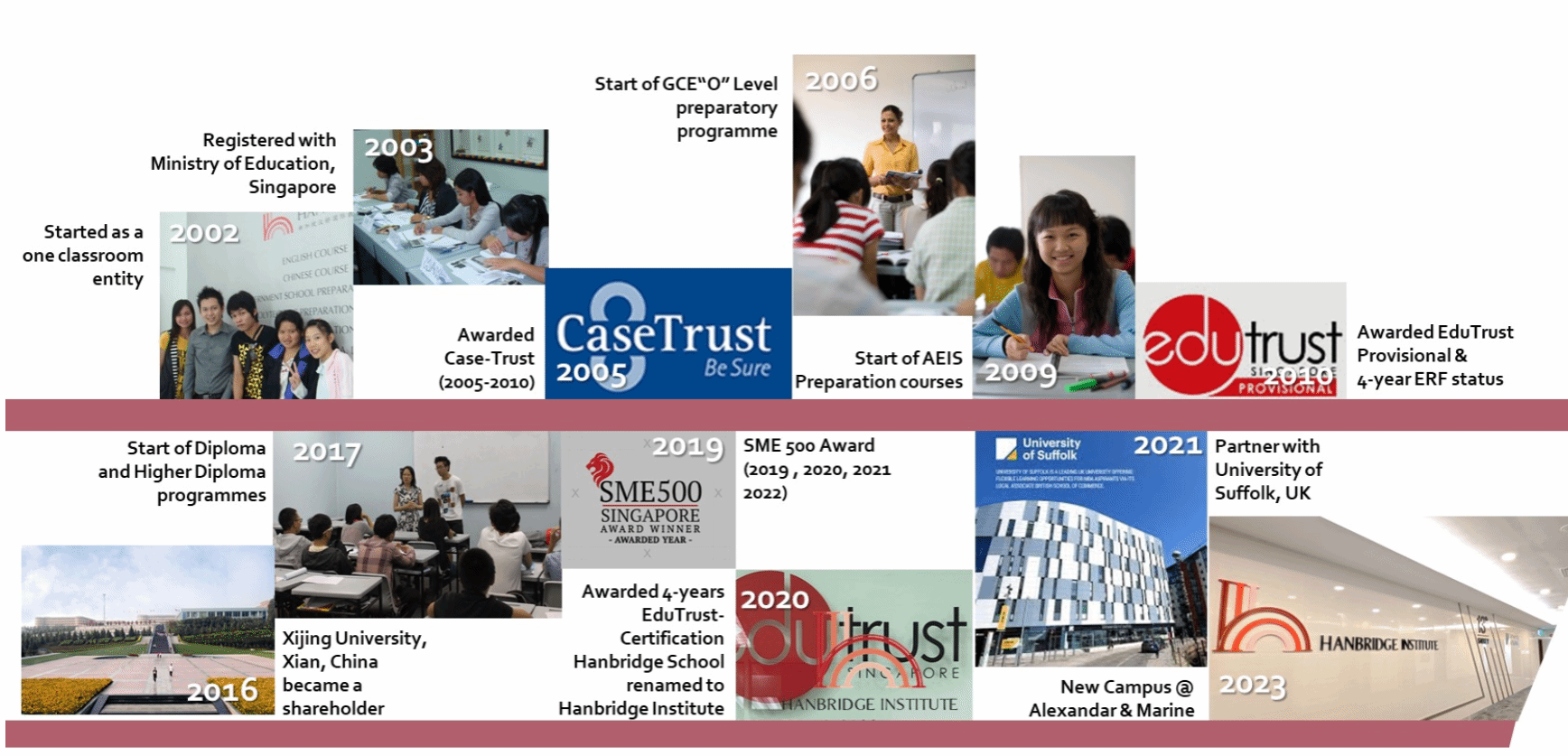 新加坡汉桥学院成立于2003年,是新加坡私立教育委员会教育信托(EduTrust)四年认证的知名高等教育学府。并于20213月,由新加坡教育部技能创前程委员会(SSG)指定为新加坡职业技能资格证书(WSQ)培训中心。2003年成立至今,汉桥学院已经发展成为一所覆盖7岁到70岁全年龄段教育的综合高等院校,目前学校提供AE1S和新加城剑桥“0”水准预备课程,英国萨福克大学本科、硕士课程,大学生海外交换课程,WSQ课程和教师培训及学生游学、研学项目。学校长久以来的办学宗旨是不断优化学术团队,提升教学质量,以保障学生们顺利地考入自己理想的目标院校。汉桥学院自创立以来坚持为学生提供卓越的教育和支持,以帮助他们实现成功的学业和职业发展。