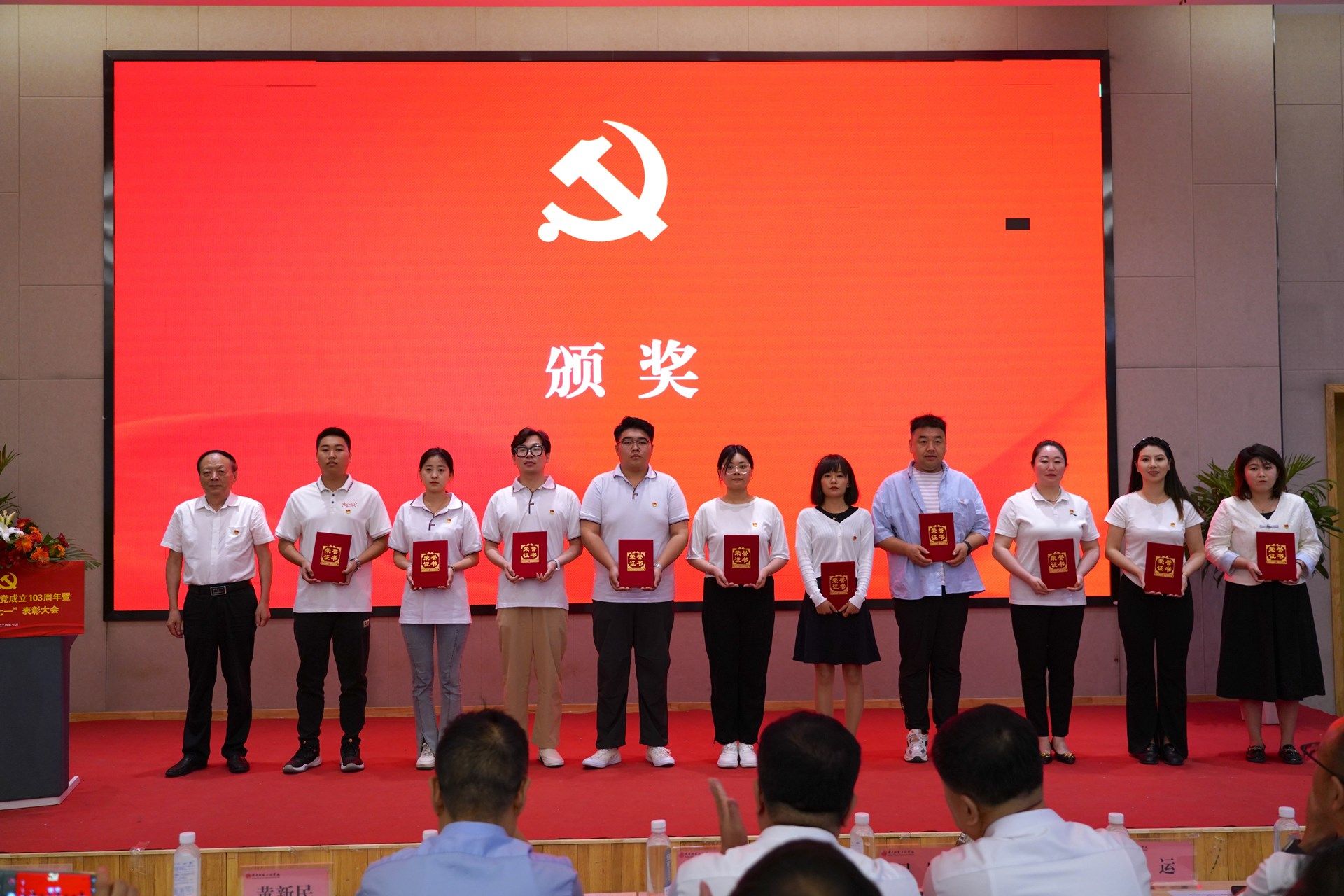 与会校领导王岗、吕超、校长姜寿山、副校长黄新民、副校长刘运、党委委员校长助理罗文谦等为受表彰的先进基层党组织、优秀党务工作者、优秀共产党员代表、优秀学生思想政治教育工作者颁奖。