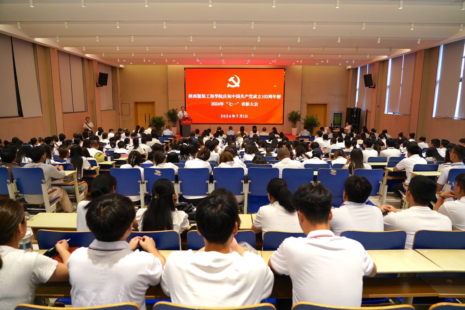陕服新闻网讯(李文斌)7月1日下午,为回顾党的光辉历程,传承发扬党的优良传统和作风,激发党员爱党爱国爱校热情,增强基层党组织的凝聚力、向心力和战斗力,增强党员的荣誉感、责任感和归属感,展示学校各级党组织在各项工作中取得的丰硕成果,表彰先进、鼓舞干劲,学校在E-4报告厅举行庆祝中国共产党建党103周年暨“七一”表彰大会。全体在校党员校领导,校党委委员、纪委委员,党委工作部门负责人;各院党委、党总支、直属党支部书记,党员院领导;各机关党支部、师生党支部书记;受表彰先进个人和师生党员代表等参加会议。会议由校党委副书记、纪委书记刘继兵主持。