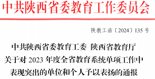 陕服新闻网讯(李文斌)近期,省委教育工委省教育厅对2023年度在全省教育系统单项工作中表现突出的单位和个人予以通报表扬,我校党委副书记刘继兵同志、教务处副处长杨红强同志在表扬之列。