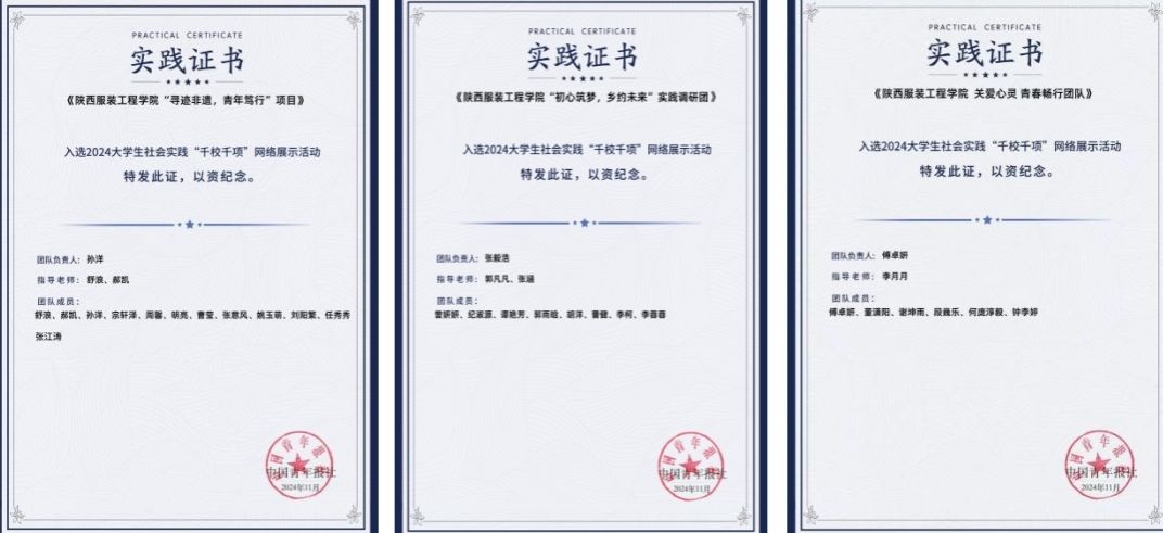 郭凡凡老师指导的“初心筑梦 乡约未来”社会实践调研团、舒浪、郝凯老师指导的“寻迹非遗 青年笃行”项目和李月月老师指导的“关爱心灵”青春畅行团队3支队伍成功获评中国青年报“千校千项”网络展示活动“全国优秀项目”。