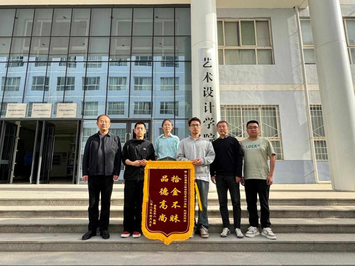 陕服新闻网讯(高岚)4月10日下午,一面写有“拾金不昧 品德高尚”的锦旗被送至我校,以此表彰我校艺术设计学院播音与主持艺术专业2022级学生赵国庆、刘恒、李佳豪三人拾金不昧的高尚行为。失主李慧女士及其家人携锦旗亲临学校致谢,艺术设计学院执行院长时晓楠及学生代表共同接受赠旗。