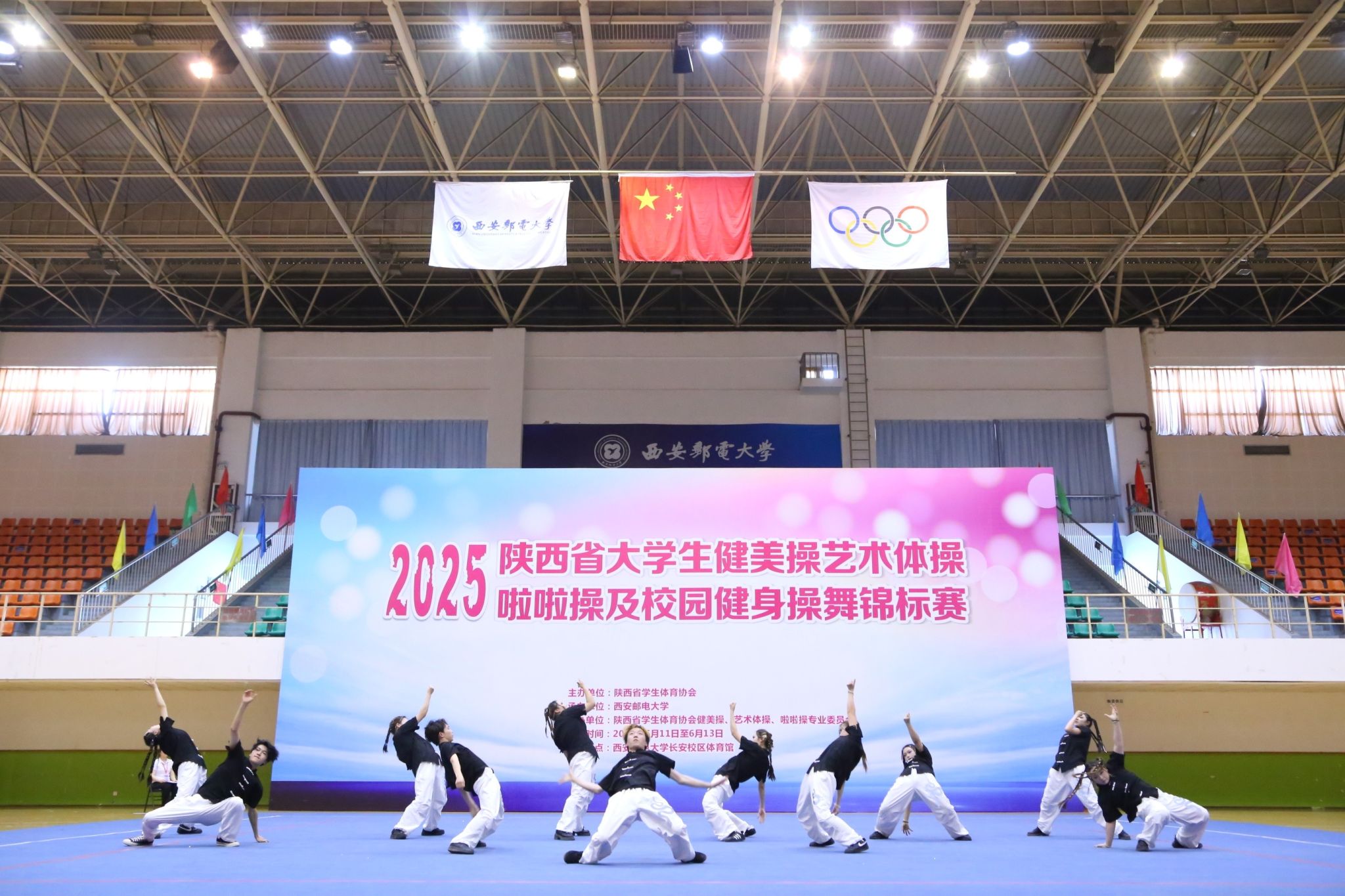 陕服新闻网讯(赵倩)6月12日下午,2025年陕西省大学生健美操、艺术体操、啦啦操及校园健身操舞锦标赛在西安邮电大学(长安校区)体育馆圆满落幕。本次比赛由陕西省学生体育协会主办,西安邮电大学承办,陕西省学生体育协会健美操、艺术体操、啦啦操专业委员会协办。来自全省40所高校900余人参加了比赛。比赛分为健美操、艺术体操、啦啦操和校园健身操舞四个大项和若干小项,并按资格分为甲、乙、丙三组。