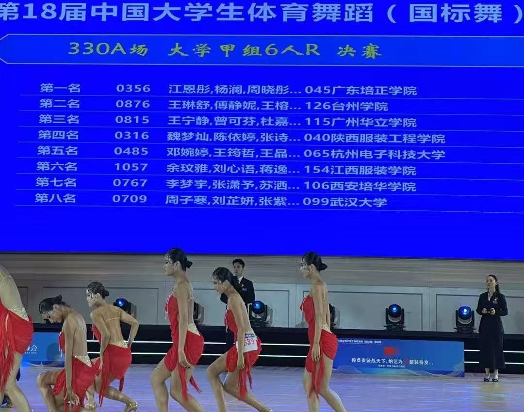 在集体舞项目的激烈比拼中,我校体育舞蹈队的队员们凭借默契的配合、精湛的技艺和昂扬的精神风貌,一路过关斩将,在大学甲组六人单项R项目中荣获第四名的优异成绩。他们的舞蹈动作整齐划一、刚柔并济,将体育舞蹈的力与美展现得淋漓尽致,赢得了现场观众的阵阵掌声和评委们的高度认可。