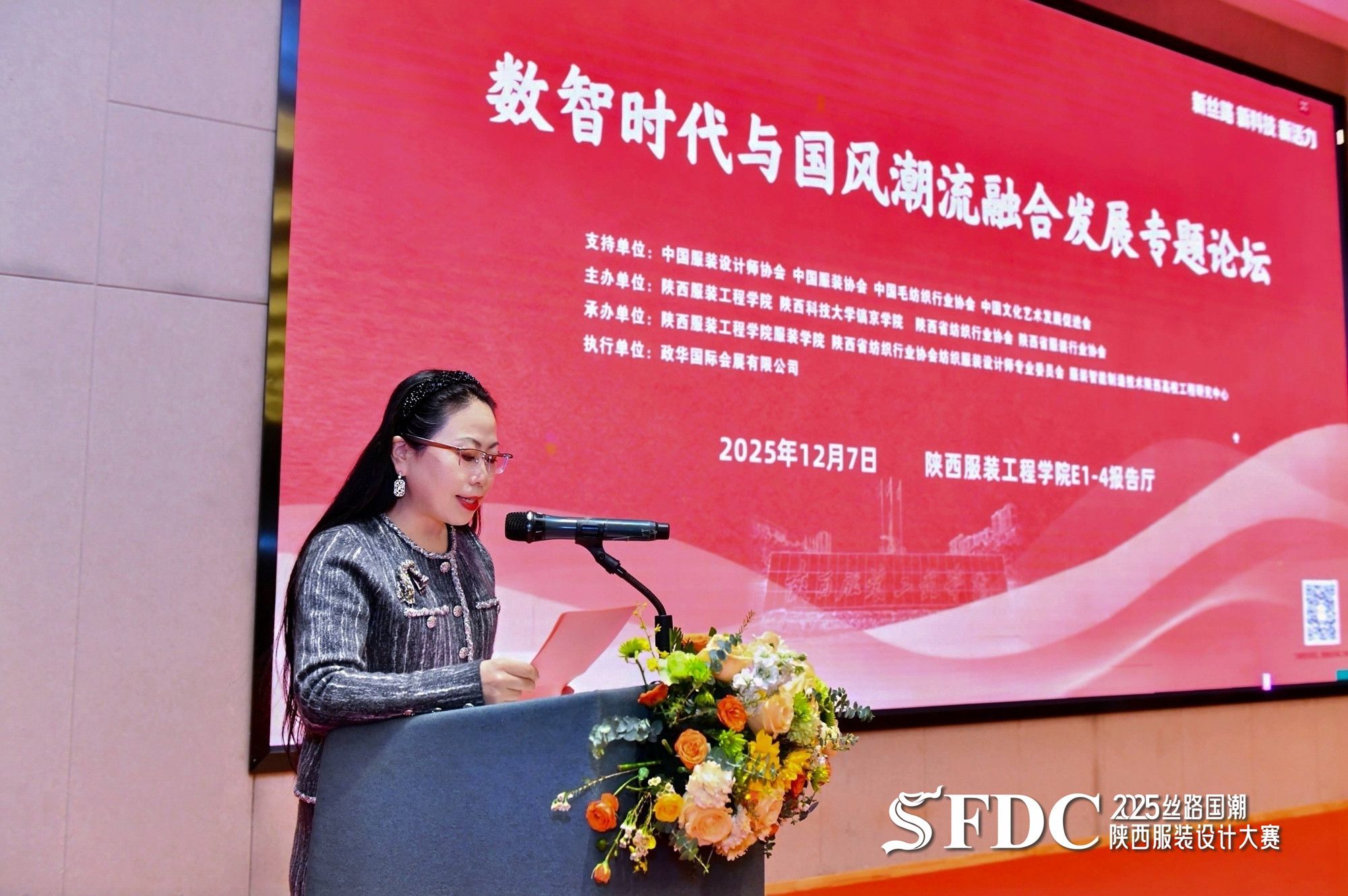 我校副校长潘庆才致开幕辞,代表学校对各位领导、嘉宾的到来表示热烈欢迎,对长期以来关心支持陕西服装产业及高校服装教育发展的各界人士表示衷心感谢。他表示,我校服装学院拥有省级一流专业集群,与长三角及珠三角龙头企业共建实践基地,不断深化校企协同,为行业输送大批复合型人才。长期以来,以AI赋能服装服饰设计、服装3D数字建模为教学特色,始终立足陕西地域文化与非遗资源,深耕服装服饰设计人才培养,此次论坛搭建了产学研用深度融合的优质平台,必将推动数智技术与国风潮流在服装领域的创新实践,助力陕西乃至全国服装产业转型升级。